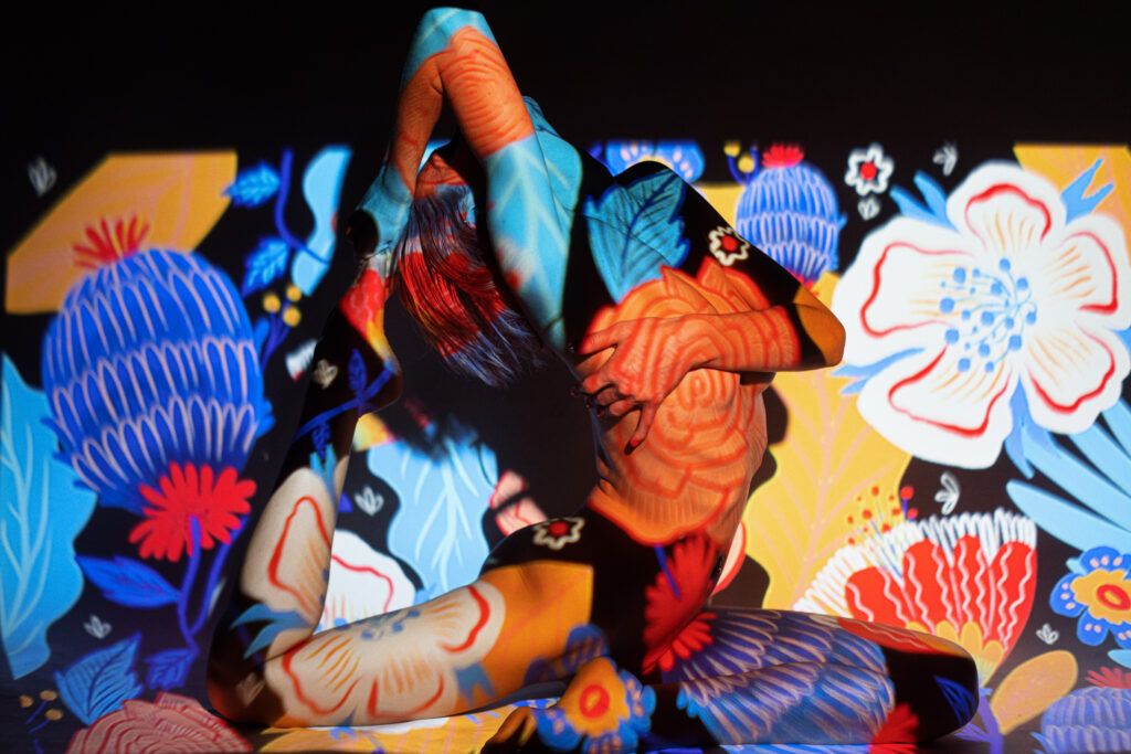 Kurt describes how the process required a bit of back and forth on the designs. The two did a couple of shoots to see how they would look projected. This back and forth required an adaptation of the illustration, both in terms of composition and colour, so Moira took the original florals and set them up as patterns, where they could more easily cover the whole model when projected.