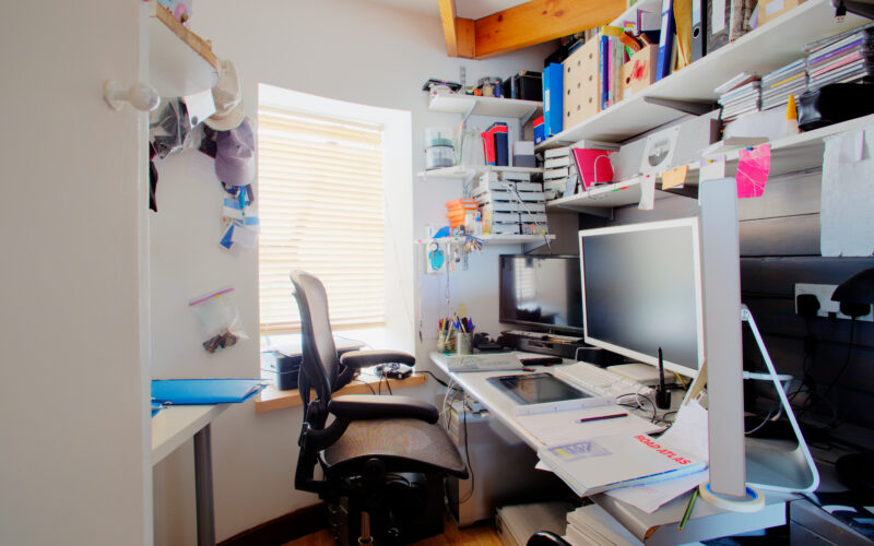 - Arrange the space with its intended use and your own work style in mind. For example, if you don’t need ample space to spread out over a large, flat work area, eliminate that space – it’s simply an invitation for clutter.