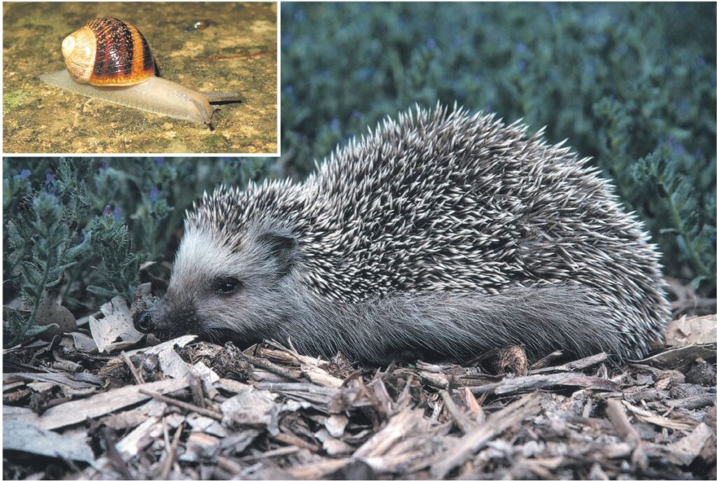 Hedgehogs are nocturnal creatures, emerging to feed at night. Photo: Denis Cachia. Inset: Garden snails are among its favourite snacks. Photo: Desirée Falzon