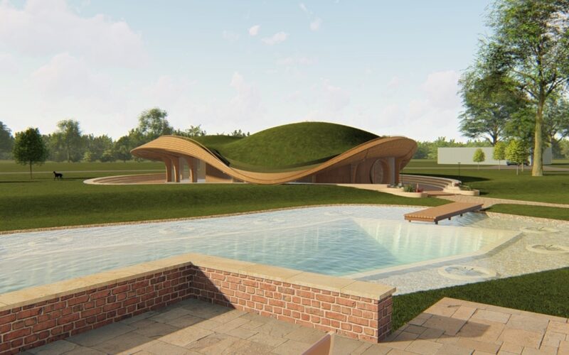 The spa mimics a natural hillock, sitting harmoniously within a bucolic English country setting. Its dune-like form will reside on the edge of a naturally filtered pool, seemingly peeling up at its edges to reveal a timber façade.
