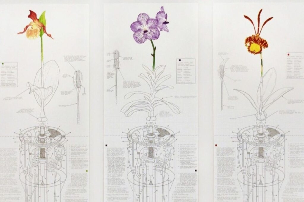 These Mechanical Orchids are a series of 33 schematic drawings on paper depicting mechanical “replacements” for orchid species from around the globe. These are collaborative works that imaginatively fuse detailed schematic drawings with botanical brilliance.