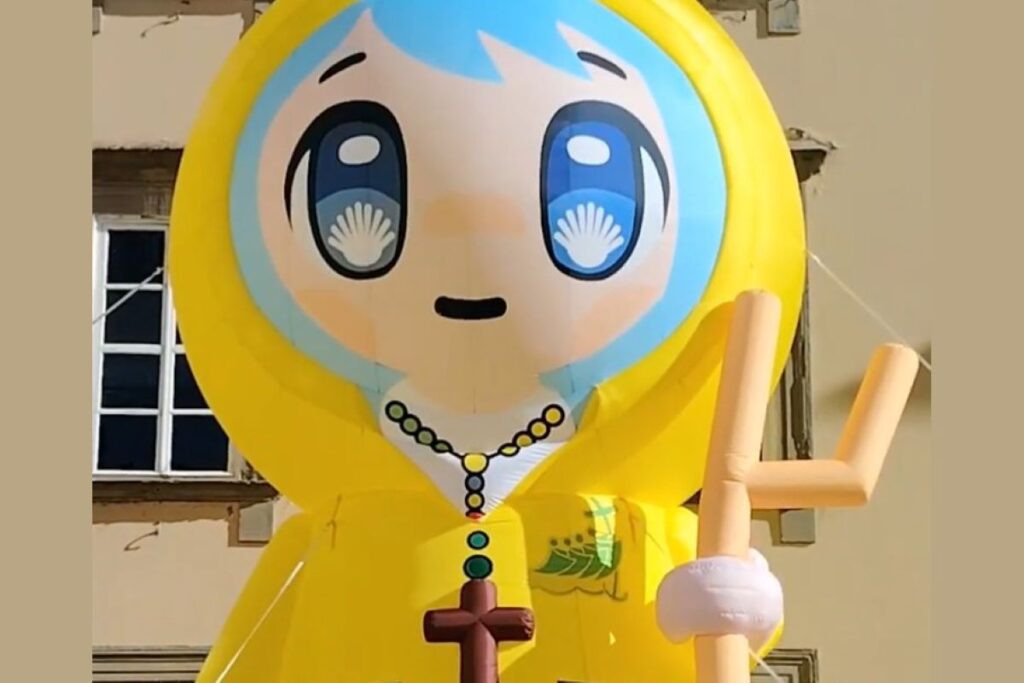Designed by Simone Legno, the mascot with big blue eyes and blue hair, and rosary beads around her neck, represents a Catholic pilgrim. She is dressed in pilgrimage garments that were standard attire throughout the centuries. Her badge, the Pilgrimage of Hope, identifies the 2025 Jubilee. It shows blue, green, yellow and red figures embracing a cross that ends in an anchor at the base, a symbol of hope. The figures form an outline of a ship sailing over the waves, evoking images of travel.