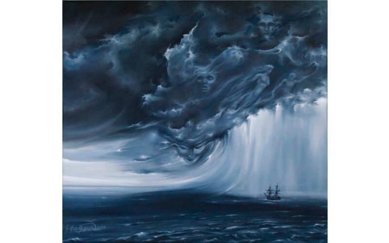 Equally as powerful is Voices of Majestic Thunder, a monochromatic seascape rendered in sweeping tones of stormy blue. Here, a lone ship drifts into an otherworldly tempest, its tiny form dwarfed by an overwhelming curtain of rain and cloud. But it is the sky itself that becomes the true subject; ghostly faces emerge within the roiling clouds.