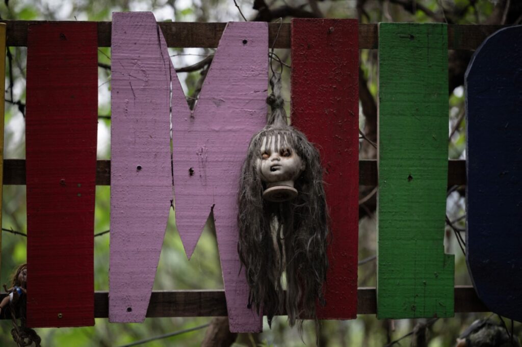 On the Island of the Dolls in Mexico City, hundreds of plastic toys wearing little more than rags hang from trees, their glass eyes staring down at visitors.