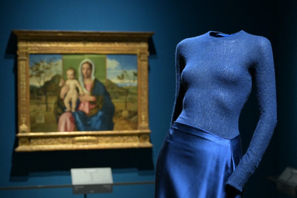 In one room, a Tuareg blue Armani skirt and top worn by actress Juliette Binoche stands in front of Giovanni Bellini’s Madonna and Child, the colour picking out the blue in the Renaissance painting.