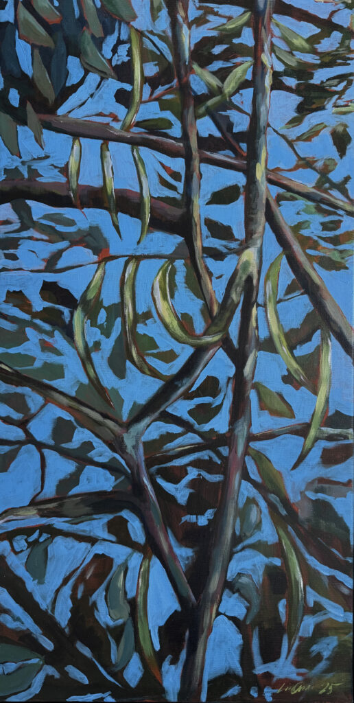 Rather than broad horizons or sweeping vistas, Cassar turns her attention to the often overlooked details of the outdoors: the layered greens of clustered leaves, the shifting geometry of branches, the play of dappled light across dense undergrowth.