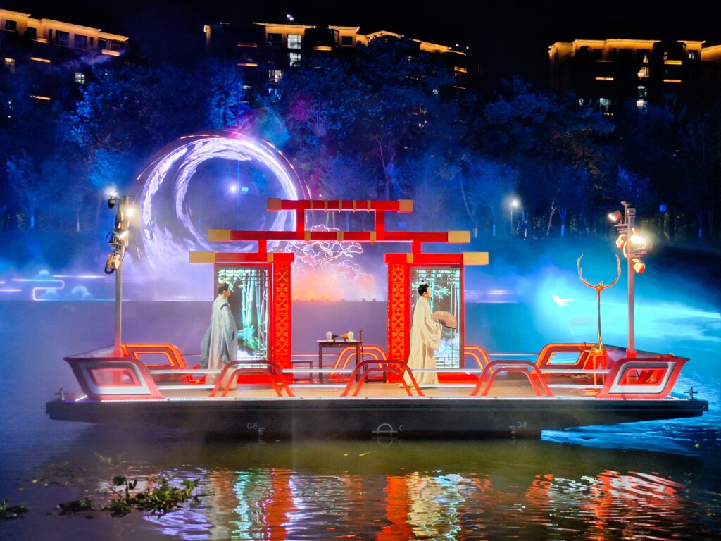 In the evening, we joined the Baiyun Lake Night Cruise. The hour-long route runs from Shunjing Bridge to Bianzhong Bridge, unfolding through a series of themed scenes that combine lighting, water effects, music and live performances positioned along the lake. References to the Yan Emperor, the State of Zeng and the tradition of ancient chime bells introduce key elements of Suizhou’s history through contemporary visual techniques as the boat moves steadily across the water.