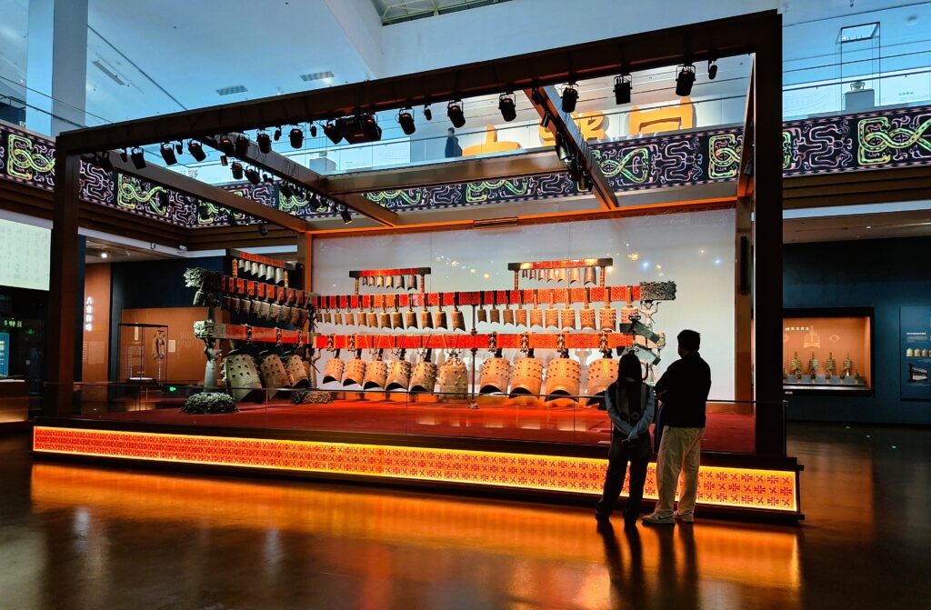 Beyond the atrium, the galleries trace Suizhou’s archaeological importance through displays of ritual bronzes, jade objects and replicas of the renowned bronze chime bells associated with the State of Zeng and Marquis Yi. While the original bells are housed at the Hubei Provincial Museum, the presentation here places them firmly within their historical and cultural context, illustrating the role of music, ritual and political life in early China.
