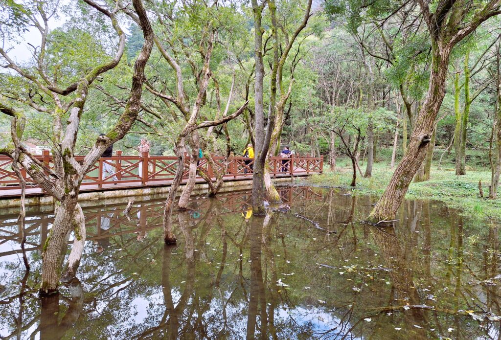 From the pool, we continued along a wooden walkway beside the water. On one side of the path, trees rose directly from the pond, their trunks emerging through the surface. The area was silent, broken only by our footsteps, and walking there created a strong sense of immersion in the natural setting.