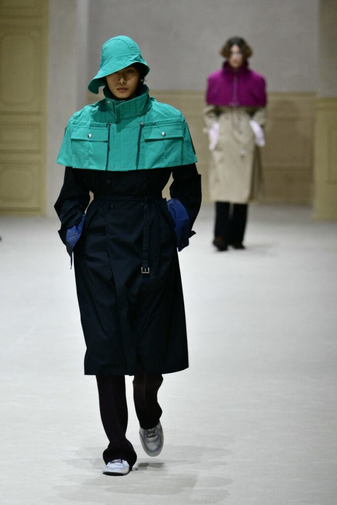 Long coats hanging over the models’ slender frames were paired with round cotton caps draped jauntily over their shoulders, while short and colourful waterproof capes decorated other coats, as if for young, fashionable cardinals protecting themselves from the outside world.