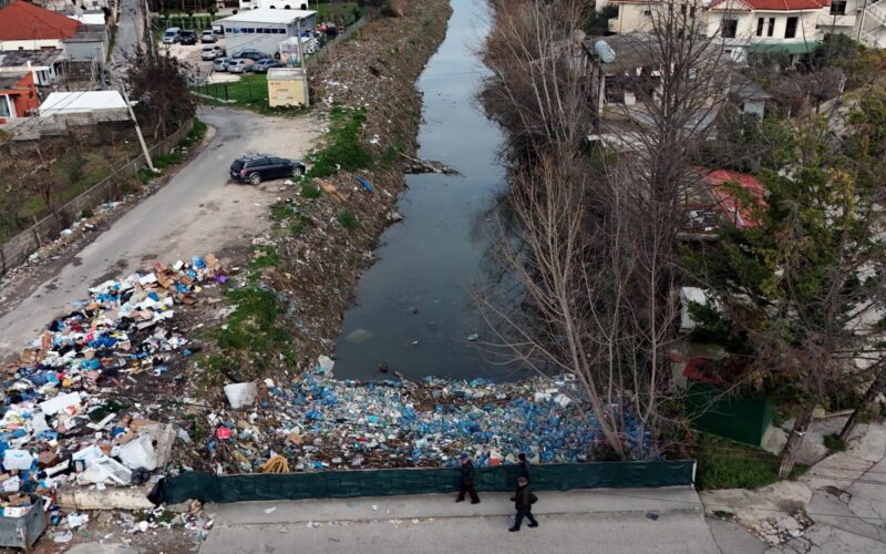 Local residents walk on a bridge, above plastic trash-filled floodwaters following heavy rains, in Durres. Photo: Adnan Beci/AFP