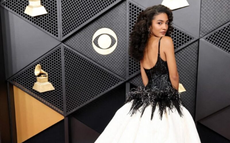 Britain’s Olivia Dean, who won the award for Best New Artist, stunned fans in an elegant Chanel gown with a full white skirt and a black bodice with tiny spaghetti straps, adorned with sequins and feathers. Her hair cascaded down her back in curls.