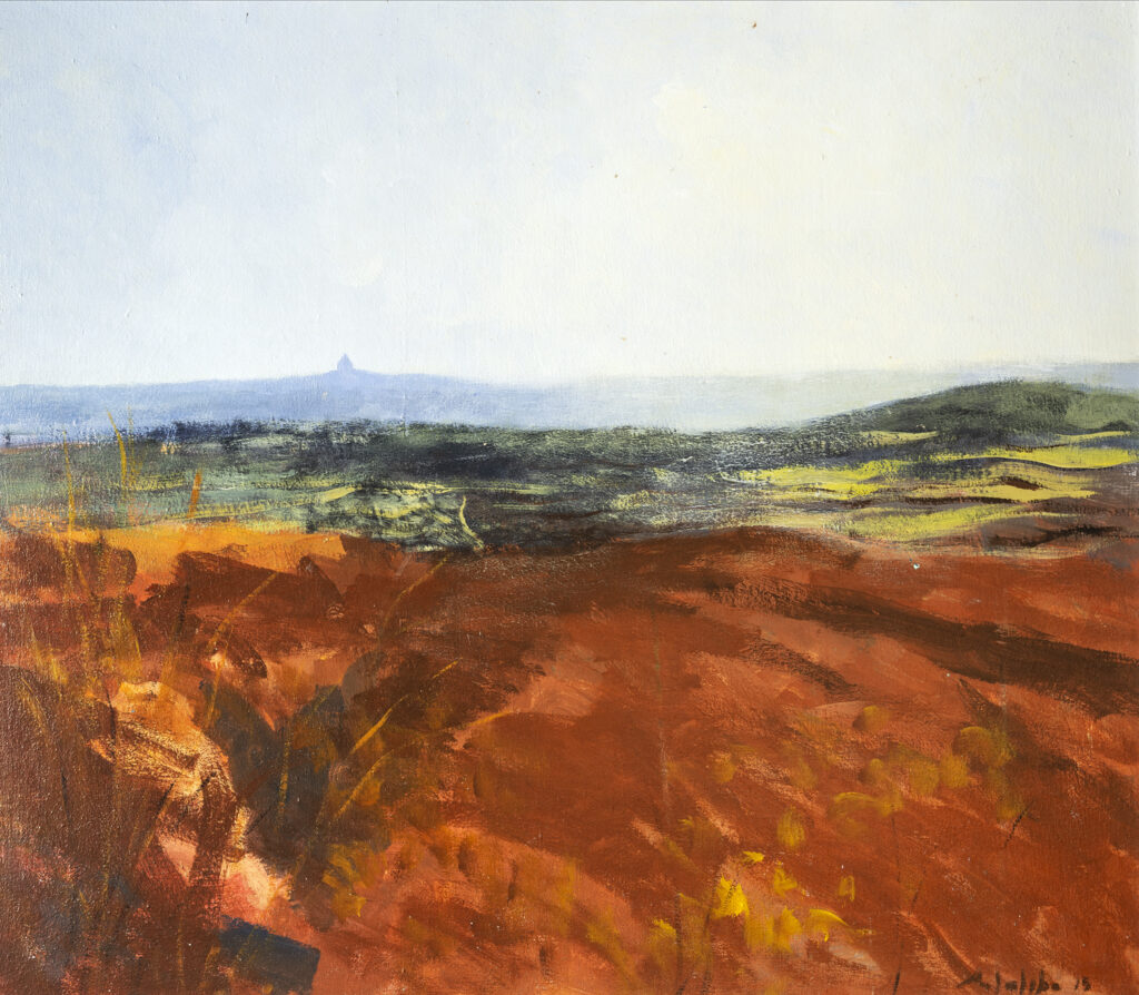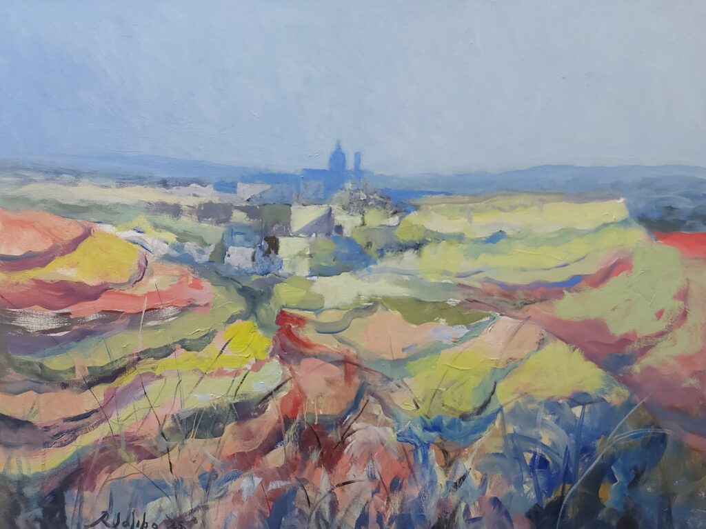 In Reflections of Tranquillity, Saliba’s landscapes invite viewers into quiet vistas suffused with light and colour. His compositions often situate the viewer at the edge of expansive fields or gently rolling terrain, where rich hues of ochre, olive and azure converge in rhythmic brushwork that conveys both calm and quiet intensity.