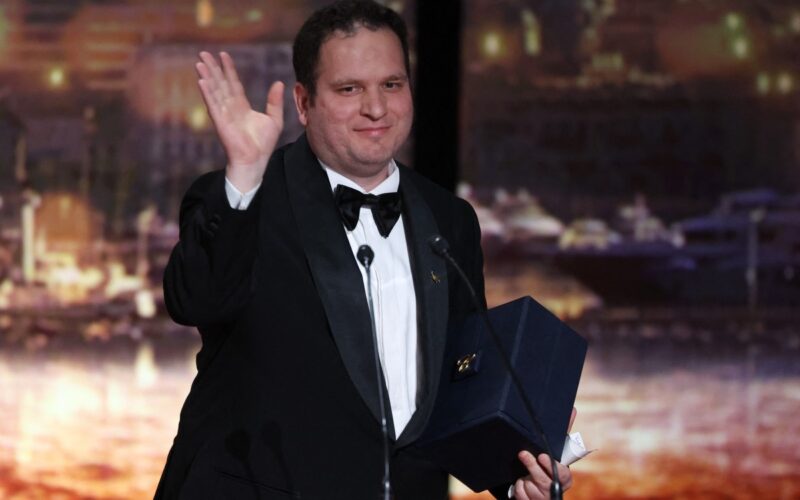 Iraqi director Hasan Hadi gesturing after winning the Camera d’Or prize for the film The President’s Cake during the closing ceremony at the 78th edition of the Cannes Film Festival in Cannes, on May 24, 2025. Photo: Sameer al-Doumy/AFP