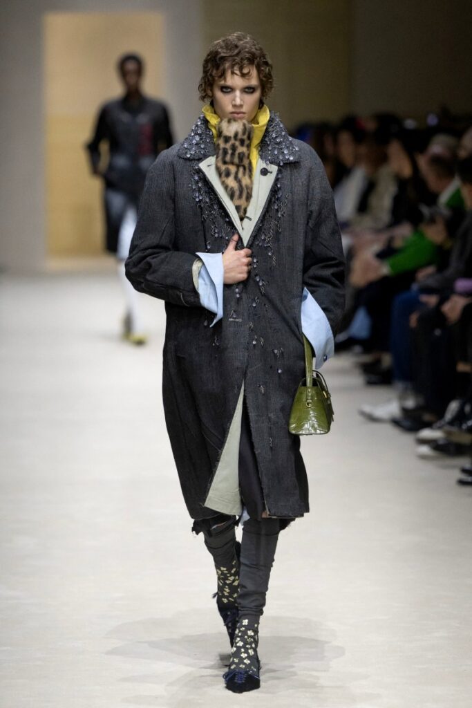 At Milan Fashion Week on Thursday, the Prada show opened with cozy knit sweaters and multi-coloured scarves, only for garments to be ripped open, exposed and distressed as the catwalk continued.