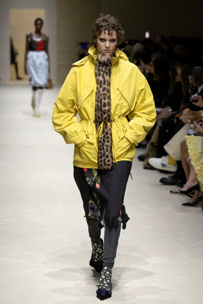 Like at the brand’s men’s show in January, a short yellow waterproof cape decorated a coat, while a beige jacket revealed bronze sequins beneath a turned-up collar.