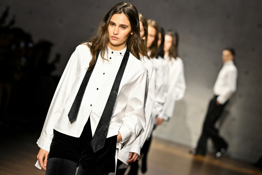 To help close out the show, a line of female models were decked in crisp and roomy white men’s shirts, paired untucked with tight black leggings and stiletto heels − a reworked tuxedo look that felt like the end of a wild night.
