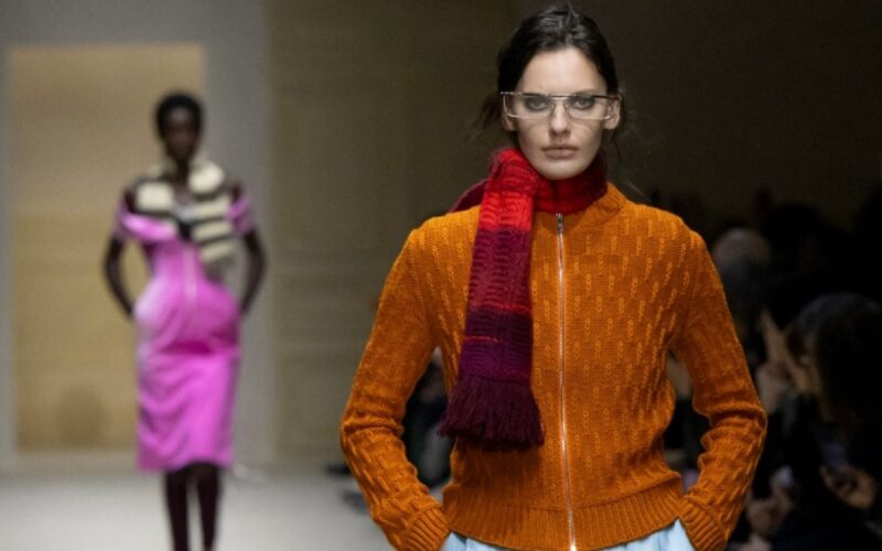 At Milan Fashion Week on Thursday, the Prada show opened with cozy knit sweaters and multi-coloured scarves, only for garments to be ripped open, exposed and distressed as the catwalk continued.