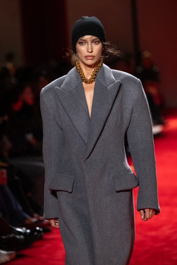 That translated to the coats, long jackets and coat dresses with bold, exaggerated shoulders − “like armour”, Trotter said − some of them with an accompanying brown leather belt that dangled, sword-like, from the waist.