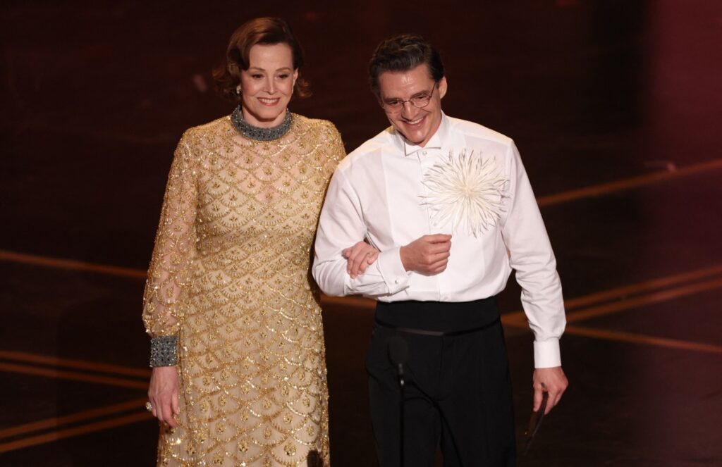 While presenting awards, Sigourney Weaver and Pedro Pascal − stars of this year’s Star Wars film The Mandalorian & Grogu − performed a bit that featured Grogu (also known as Baby Yoda) in the audience.