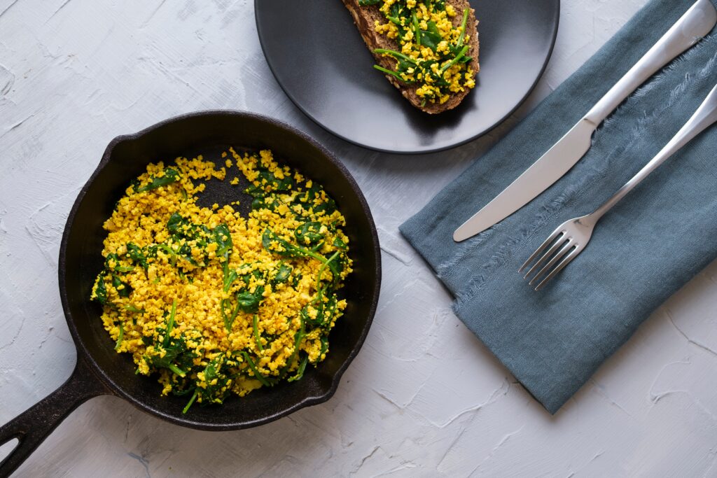 Firm tofu also has a sturdy texture, making it perfect for a savoury breakfast. I like to do a tofu scramble (a plant-based alternative to scrambled eggs). To make it taste like a traditional dish, I use turmeric to emulate the yellow colour of yolks, black salt for the characteristic “eggy” smell and nutritional yeast for a savoury, slightly cheesy depth.