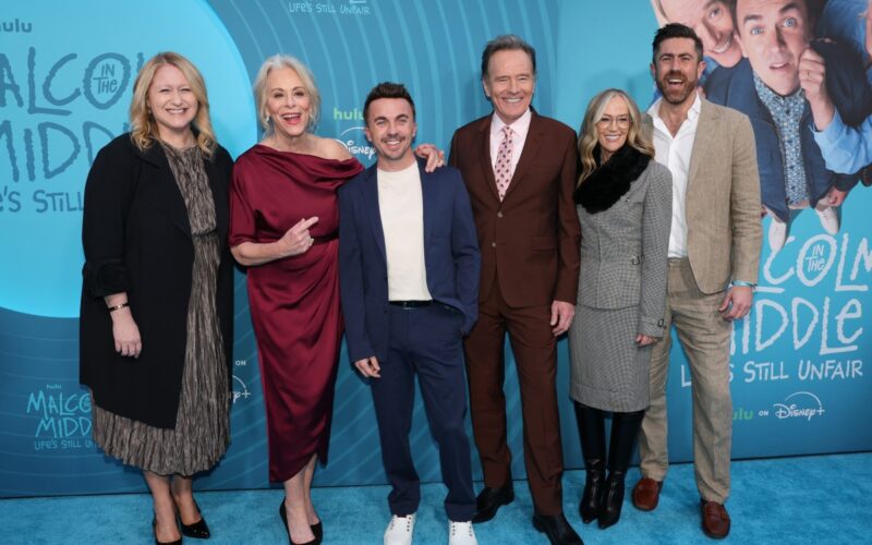 From left, chairperson of The Walt Disney Company, Debra O’Connell, actors Jane Kaczmarek, Bryan Cranston and Frankie Muniz, president of 20th Television Karey Burke and EVP Live Action & Alternative TV series Disney Branded TV Charlie Andrews attending Hulu’s ‘Malcolm in the Middle: Life’s Still Unfair’ premiere at the DGA theatre in New York on April 7. Photo: Angela Weiss/AFP