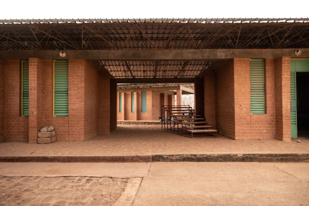He used local red clay and cement to make bricks that provide thermal protection in the hot climate and shielded the structure from rain with a large overhanging roof that towers above the building, rather than sitting atop it trapping heat.